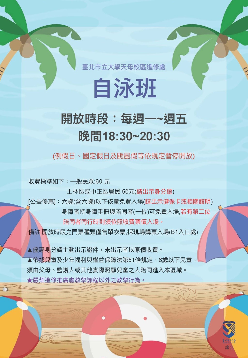 【天母校區】詩欣館自泳班(小池)開放公告