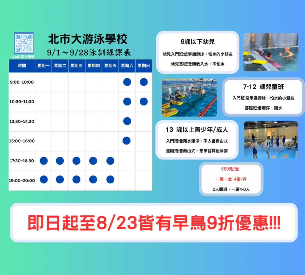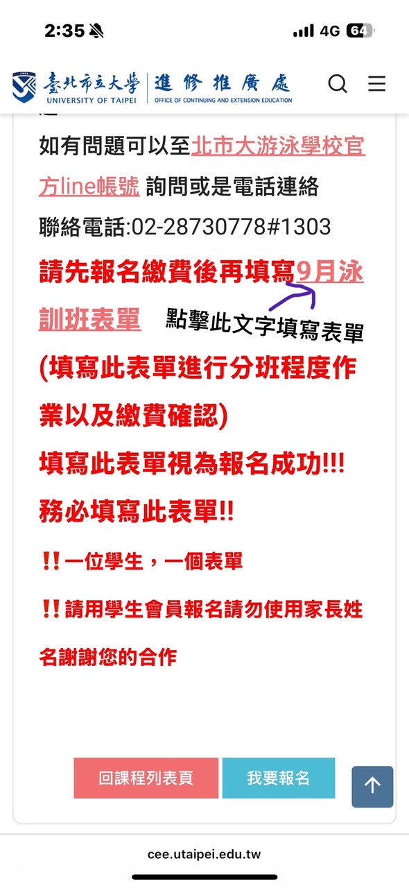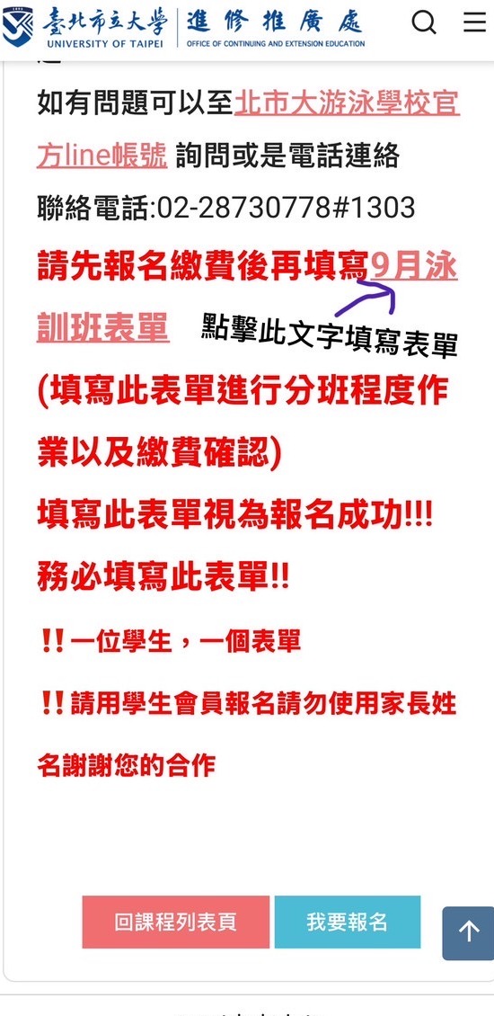 如有問題可以至北市大游泳學校官方line帳號 詢問或是電話連絡