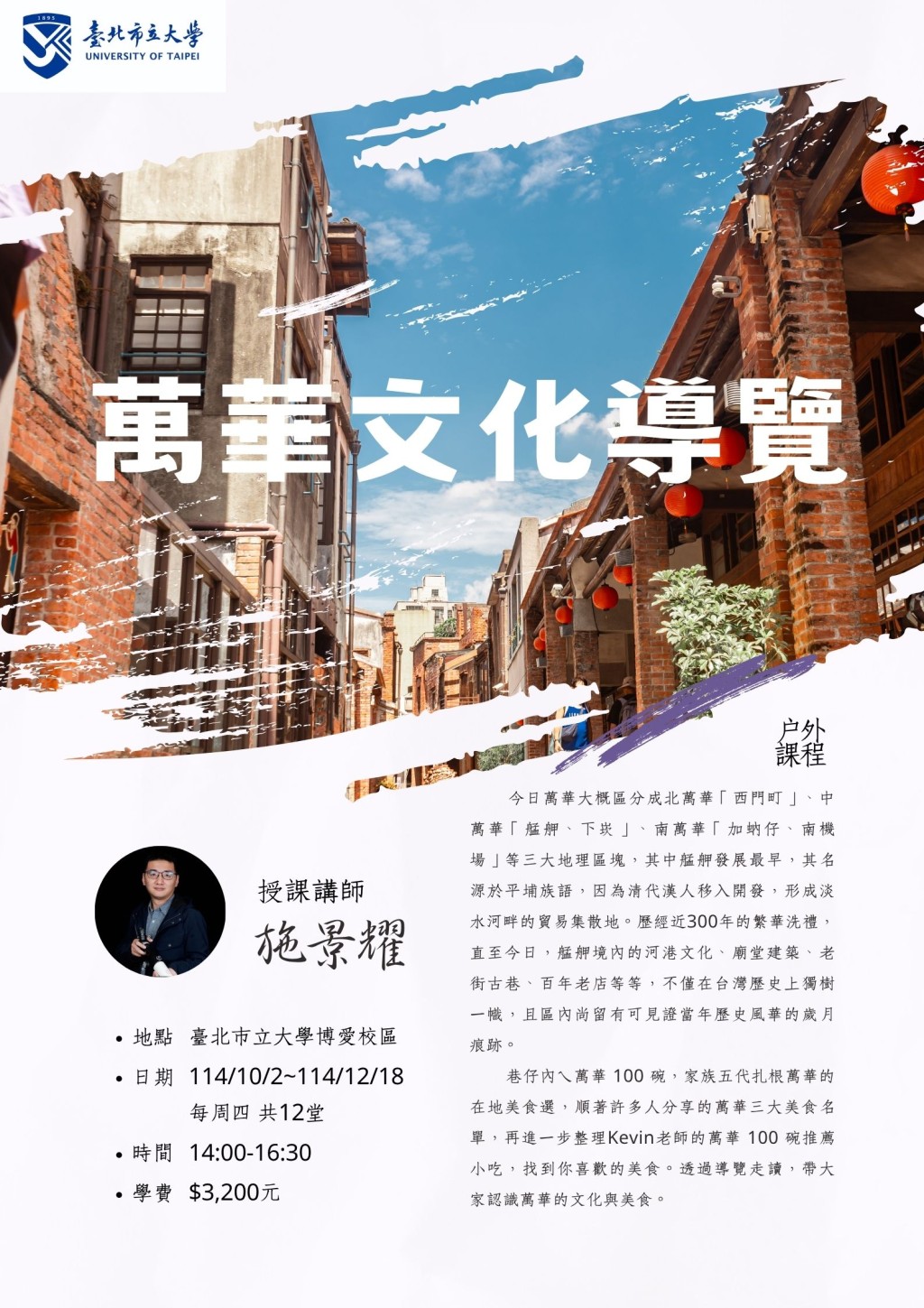 巷仔內ㄟ萬華 100 碗,家族五代扎根萬華的在地美食選,順著許多人分享的萬華三大美食名單,再進一步整理Kevin老師的萬華 100 碗推薦小吃,找到你喜歡的美食。透過導覽走讀,帶大家認識萬華的文化與美食。