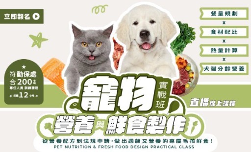 《寵物營養與鮮食製作實戰班|直播線上課程》結合犬貓營養學、六大類食材解析、熱量與比例計算、食安觀念與法規知識,手把手教你設計出適齡、健康、安全的毛孩專屬鮮食。從基礎代謝生理、必需營養素、疾病調整,到自製鮮食的製作技巧、保存管理、販售標示與登錄流程,打造出從理論到實務、從飼主照護到創業應用的一條龍實戰課程。不論你是飼主、創業者,還是寵物產業從業者,這堂課都能幫助你一次搞懂寵物鮮食的營養設計與合法製作流程!