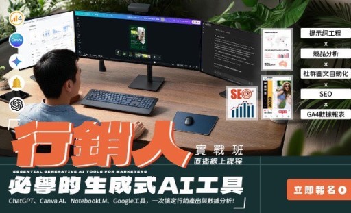 《行銷人該學的生成式AI技巧實戰班|線上課程》專為行銷企劃、公部門承辦與品牌經營者設計,聚焦生成式AI在行銷領域的應用,幫助學員以最實用的方式掌握最新 AI 工具與自動化技巧。課程中將帶你從 ChatGPT 提示詞工程設計 到 NotebookLM 資料整理,再到 Canva AI 與 Ideogram 圖像設計,全程實作,快速生成貼文文案、社群圖像與簡報。同時課程深入 SEO關鍵字分析與內容優化,並結合 Google Analytics 4(GA4)數據追蹤,學會建立跨平台 ROAS投報率儀表板,掌握數據驅動的行銷決策。更包含競品爬蟲分析、消費者洞察報告生成、Google Trends 熱門搜尋分析 等,打造完整的 AI行銷自動化工作流程。上完課,你將能運用 生成式AI工具 快速產出內容、數據報表與行銷策略,真正達到 高效、精準、即學即用!