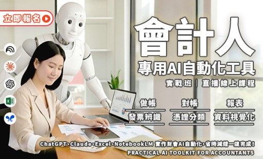 《會計人專用AI自動化工具實戰班|線上課程》專為會計人、財務人員與公職財會設計,透過 ChatGPT、Claude、Excel、NotebookLM、Google AI Studio 等免程式AI工具,帶你實作會計自動化流程。課程涵蓋 Excel 自動化公式與巨集應用、AI輔助分錄分析、月結報表批次處理、憑證影像辨識與自動分類、財務數據視覺化與儀表板製作,並延伸至 AI 驅動的財務預測與多情境決策模型。學員將學會設計會計專屬提示詞、建立智慧報表、自動產出財務簡報,讓做帳、對帳、報表流程一次搞定,大幅提升效率、降低錯誤率。無論是中小企業財會、內外帳會計或公務人員,皆能快速上手,打造專屬AI財務助理,全面升級帳務處理效能!