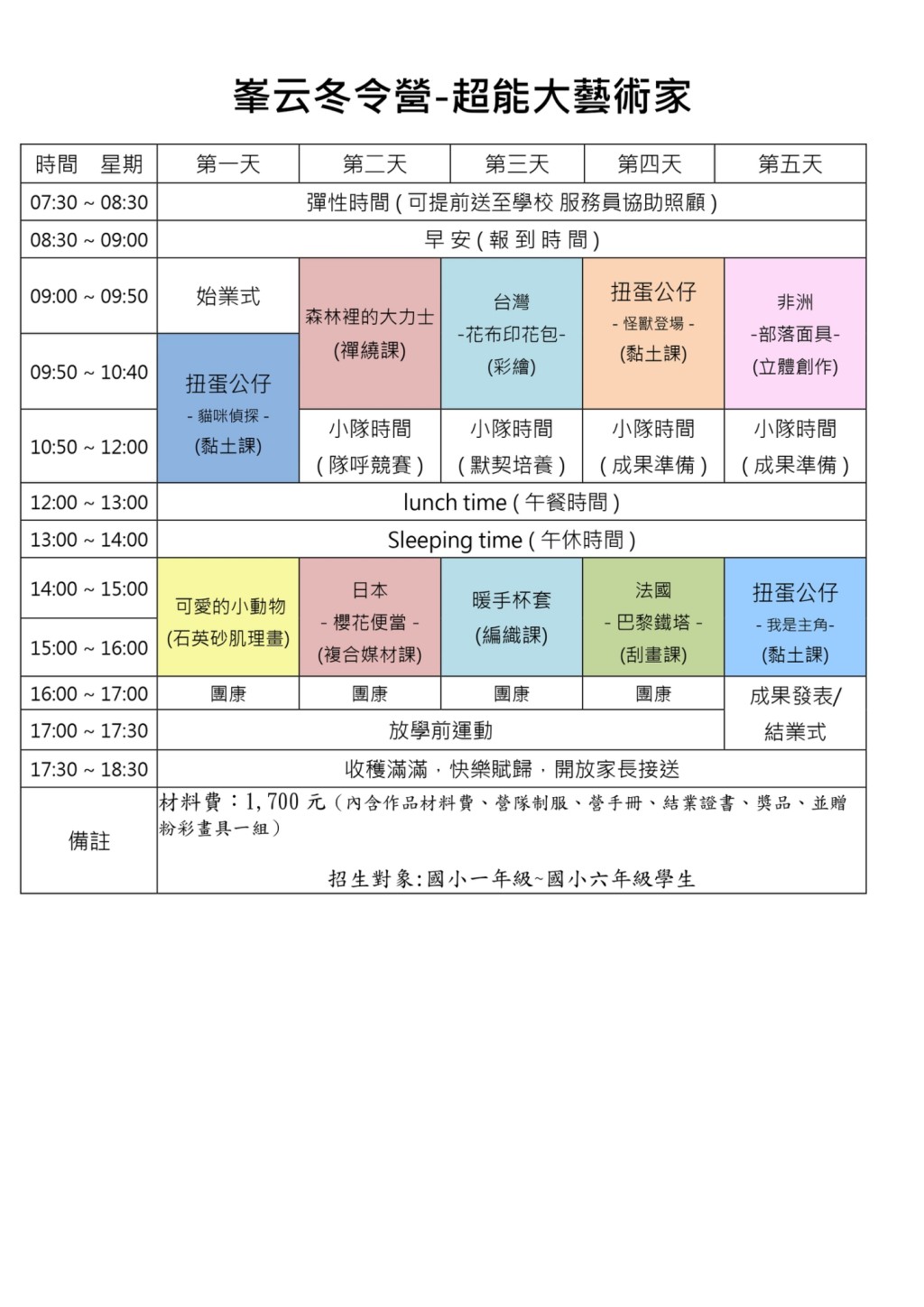 合作營隊學費不含材料費,材料費1,700元請於第一堂課繳交現金。