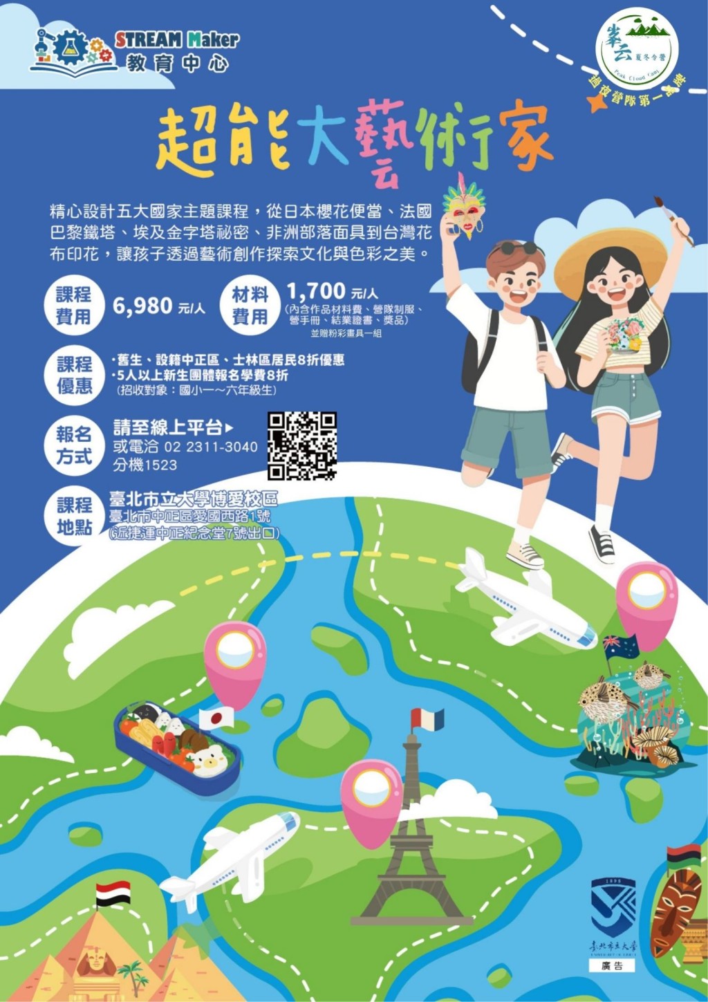 精心設計五大國家主題課程,從日本櫻花便當、法國巴黎鐵塔、埃及金字塔秘密、非洲部落面具到台灣花布印花,讓孩子透過藝術創作探索文化與色彩之美。