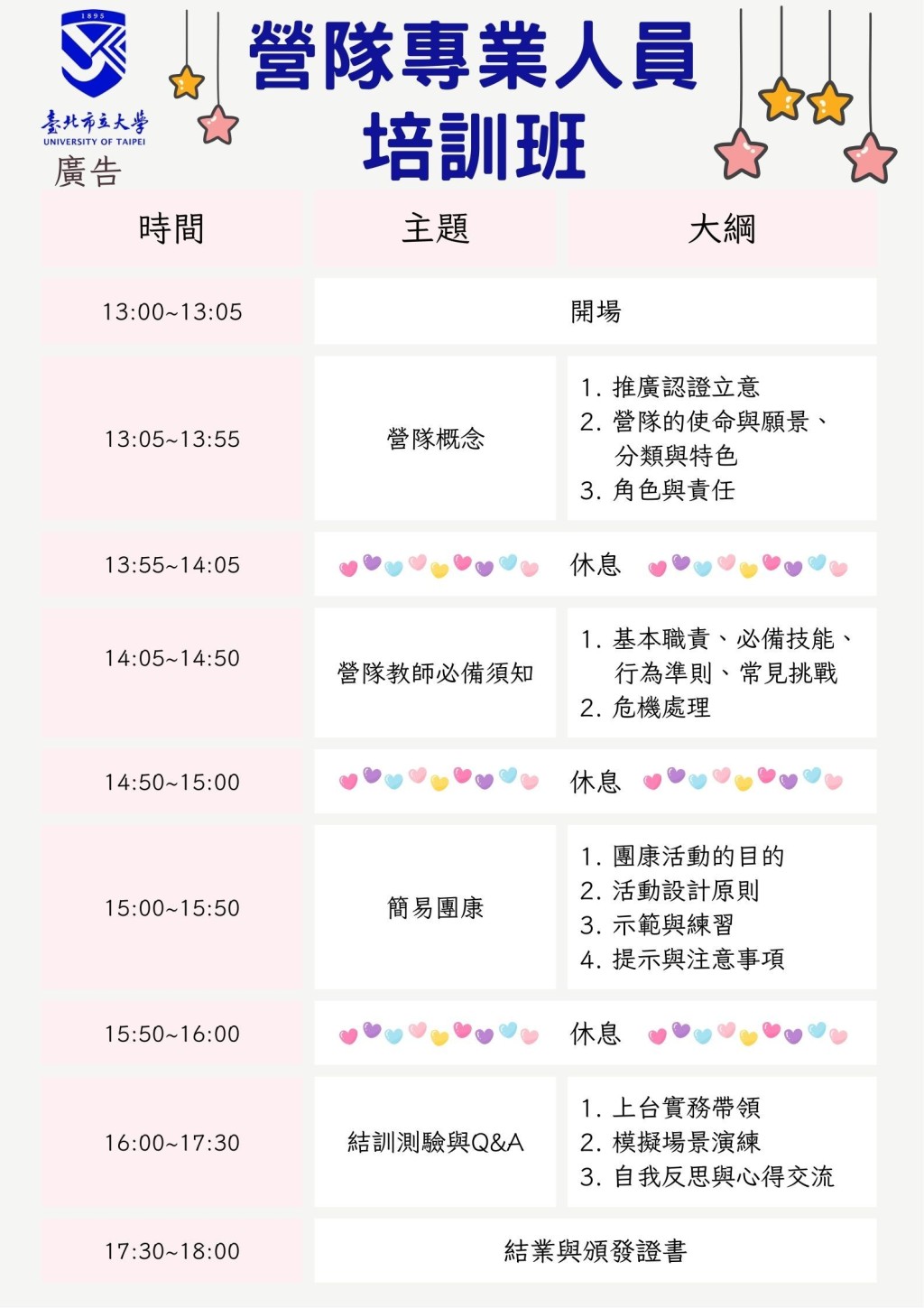 為培養具備教育熱忱、專業素養與團隊合作能力的營隊師資與對輔老師,特開設本培訓課程。 透過一天密集式訓練,讓參與者在理論與實務中,學會以「生命影響生命」的教育精神,成為能引導孩子成長的優質師資。