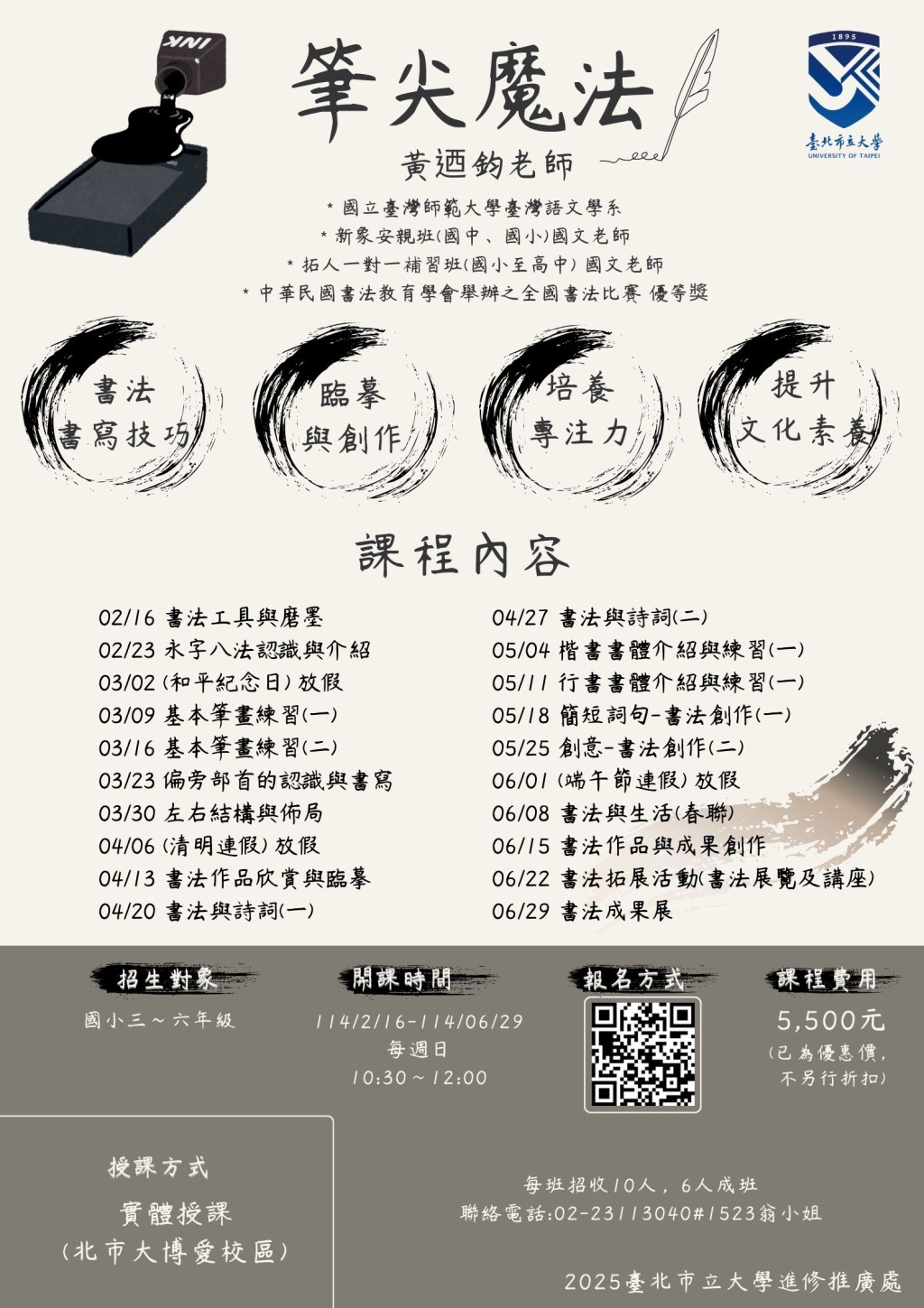 本課程以循序漸進的方式,從基礎筆劃到完整字句,幫助學生扎實掌握書寫技巧;結合經典詩詞與書法大師作品,提升文化素養;透過實踐創作與作品展示,增強學生的自信與表達能力;並透過多元有趣的教學活動,激發學習興趣,同時鍛煉專注力與耐心,培養良好的學習態度與品格。