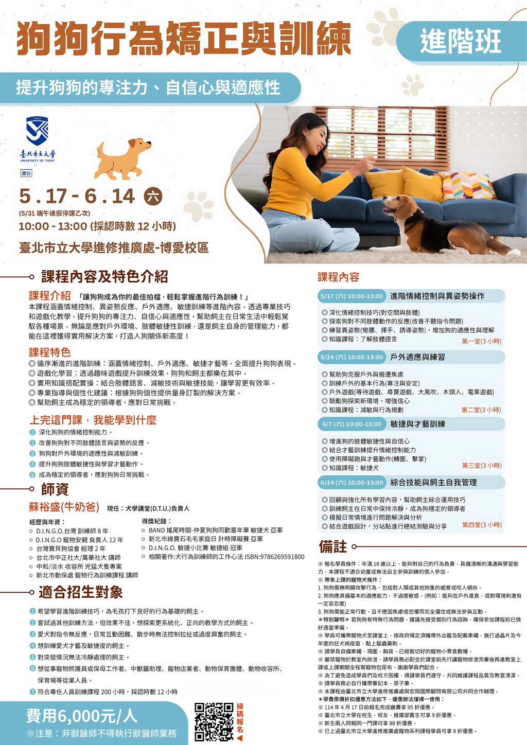 本課程涵蓋精準控制、異變勢反應、戶外適應、敏捷訓練等進階內容。透過專業技巧和遊戲化教學,提升狗狗的專注力、自信心與適應性,幫助飼主在日常生活中輕鬆駕馭各種環境。無論是應對戶外環境、肢體敏捷性訓練,還是飼主自身的管理能力,都能在這裡獲得實用解決方案,打造人狗關係新高度!