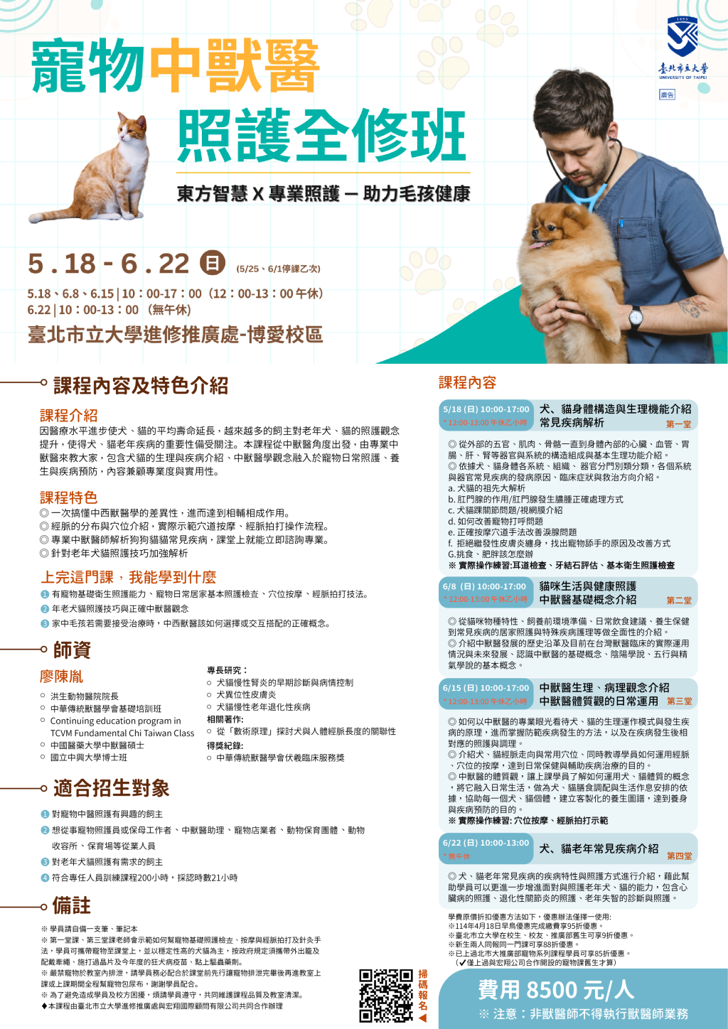 因醫療水平進步使犬、貓的平均壽命延長,越來越多的飼主對老年犬、貓的照護觀念提升,使得犬、貓老年疾病的重要性備受關注。本課程從中獸醫角度出發,由專業中獸醫來教大家,包含犬貓的生理與疾病介紹、中獸醫學觀念融入於寵物日常照護、養生與疾病預防,內容兼顧專業度與實用性。