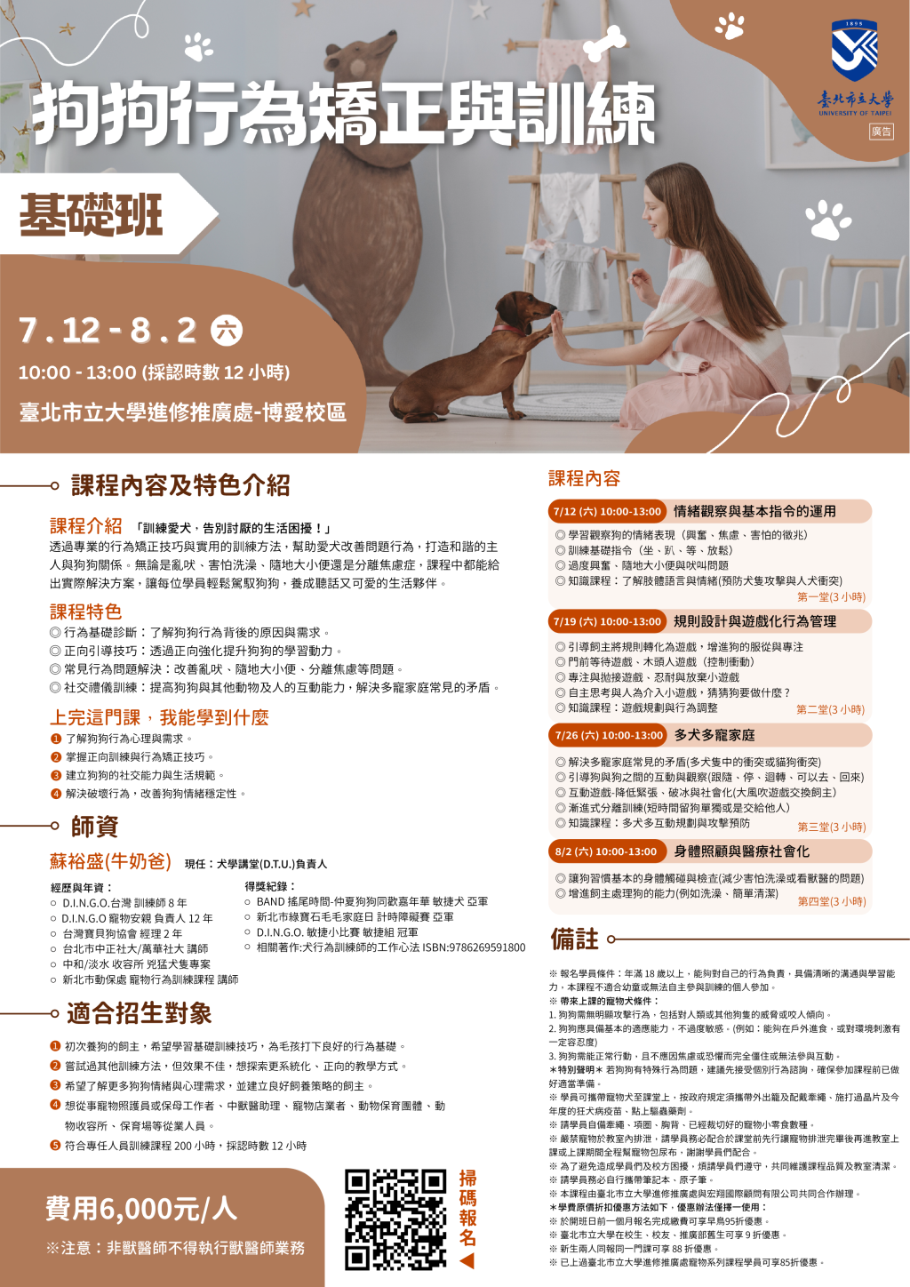 透過專業的行為矯正技巧與實用的訓練方法,幫助愛犬改善問題行為,打造和諧的主人與狗狗關係。無論是亂吠、害怕洗澡、隨地大小便還是分離焦慮,課程中都能給出實際解決方案,幫助每位飼主理解狗狗、養成穩定又可愛的生活夥伴。