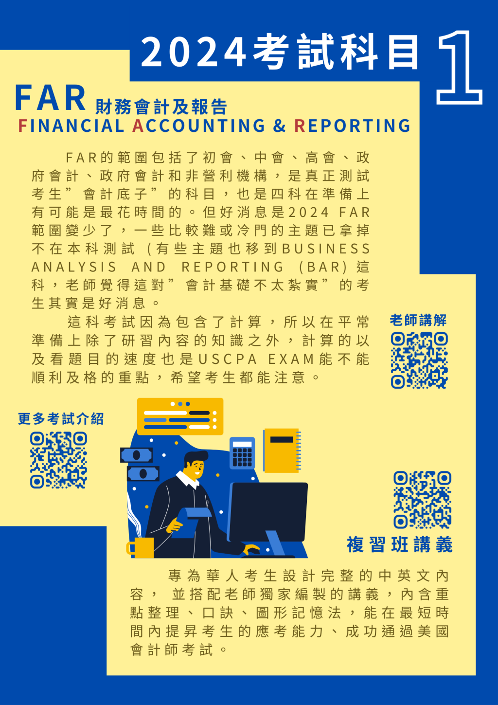 2.證照考試解題班依考試科目分別獨立班:a科:FAR、b科:AUD、c科:REG、d科:BAR。