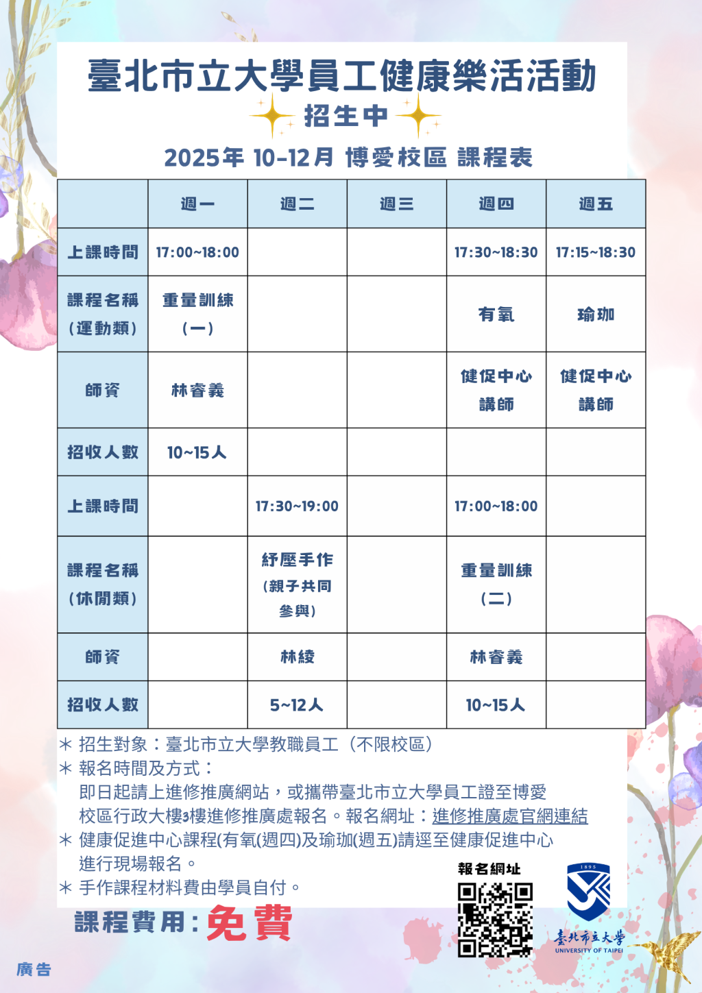 【博愛校區】北市大秋季員工健康樂活活動報名開始囉! ! !