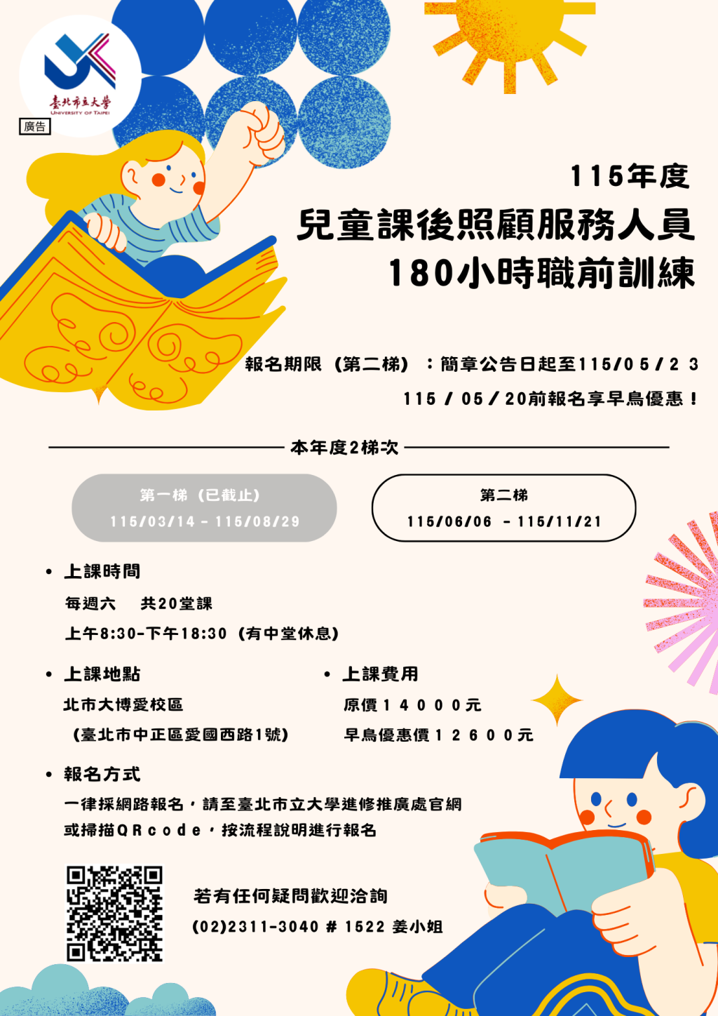 115年「兒童課後照顧服務人員180小時職前訓練」第二梯開始報名囉!
